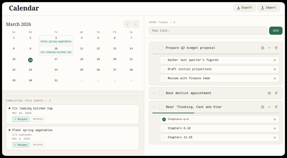 Description: I was unable to find a simple todo-and-calendar tool that quite fit what I wanted. I realised this was an opportunity to learn something new: vibe coding with Claude. What I learned most from this exercise? Think like an architect. AI is an excellent bricklayer, but a human still needs to design the building.